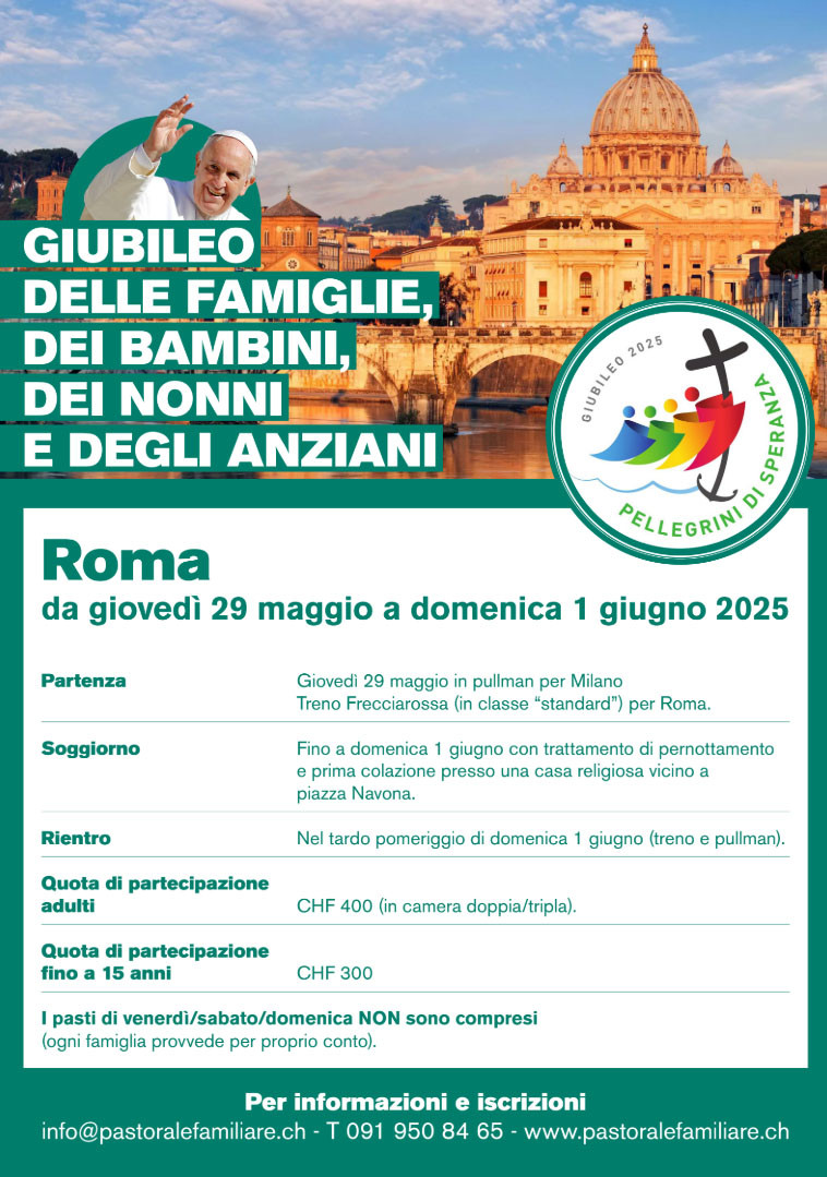La Diocesi di Lugano, nel solco dell’Anno Santo della Speranza, propone un pellegrinaggio a Roma in occasione del Giubileo delle Famiglie, dei Bambini e dei Nonni, indetto da Papa Francesco. L’iniziativa, organizzata dalla Pastorale Familiare, si svolgerà da giovedì 29 maggio alla domenica 1° giugno 2025 (ponte dell’Ascensione) e sarà un’opportunità unica per rafforzare la fede, approfondire il senso di comunità e vivere momenti di comunione in un contesto unico come quello della città eterna. Abbiamo chiesto a mons. Willy Volontè, delegato vescovile per la Pastorale Familiare e a Maria Boorsma, membro della Commissione Diocesana di Pastorale Familiare e tra le organizzatrici del pellegrinaggio, di illustrarci il programma e approfondire il significato di questo evento.