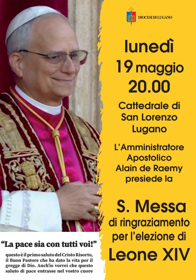 L’Amministratore apostolico della Diocesi di Lugano, mons. Alain de Raemy, invita tutti i fedeli a partecipare alla Santa Messa di ringraziamento per l’elezione del nuovo Pontefice, Leone XIV, che si terrà lunedì 19 maggio 2025 alle ore 20.00 nella Cattedrale di San Lorenzo a Lugano.
