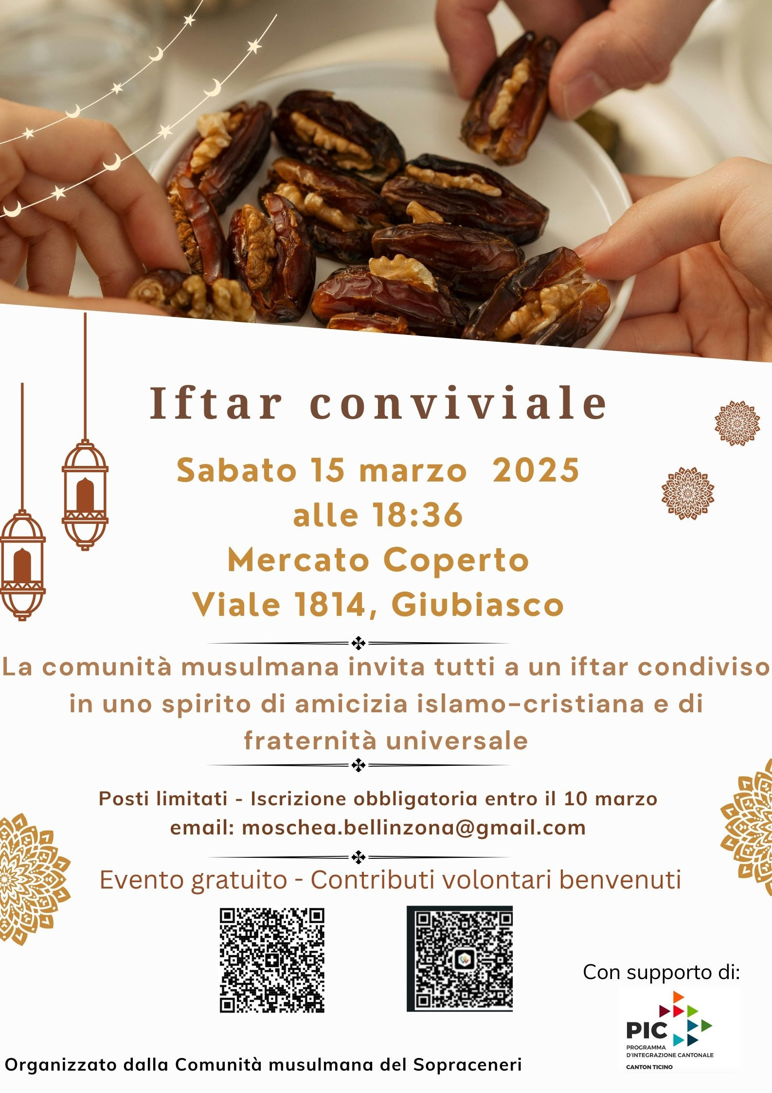 L'evento è gratuito, ma i posti sono limitati: per partecipare, è richiesta l’iscrizione entro lunedì 10 marzo scrivendo a moschea.bellinzona@gmail.com. Contributi volontari saranno accolti con gratitudine.