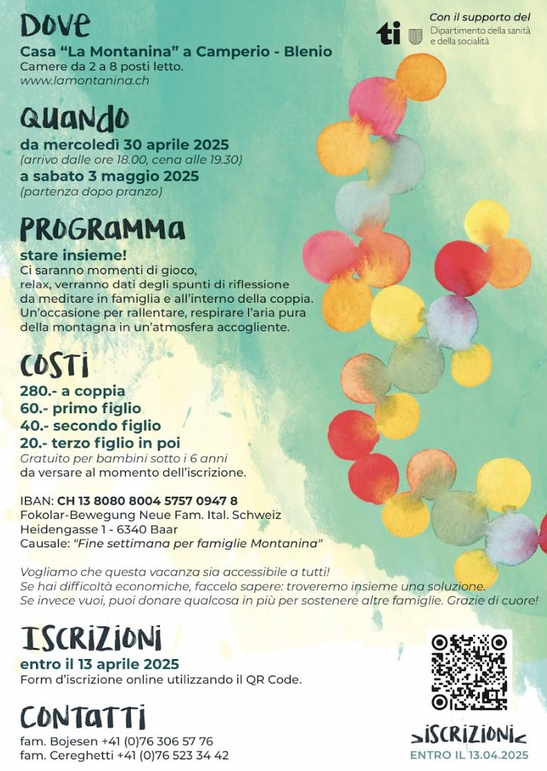 “Come in cielo così in terra”: è l’invito che le Famiglie Nuove del Movimento dei Focolari propongono da mercoledì 30 aprile a sabato 3 maggio, nell’accogliente cornice della Valle di Blenio, presso la casa di vacanza “La Montanina” di Camperio.